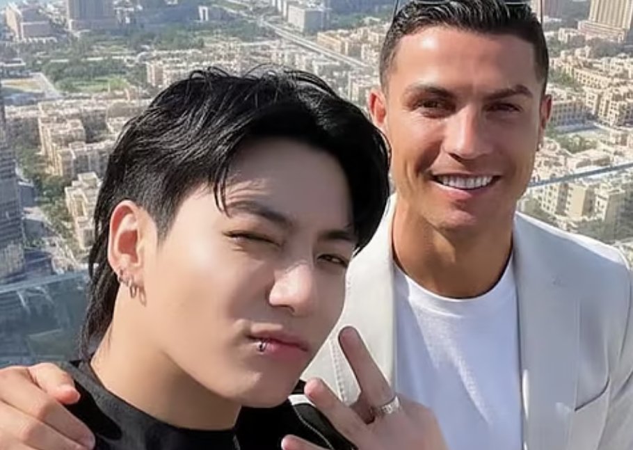 A photo just went viral of Jungkook posing with Cristiano Ronaldo in Dubai, and the internet completely exploded. Jungkook’s rocking a sleek black jacket, striking his signature pose; Ronaldo looks sharp in a grey suit with a white tee. But here’s the kicker—it’s not clear if this was a legit meet-up or some clever editing trick.