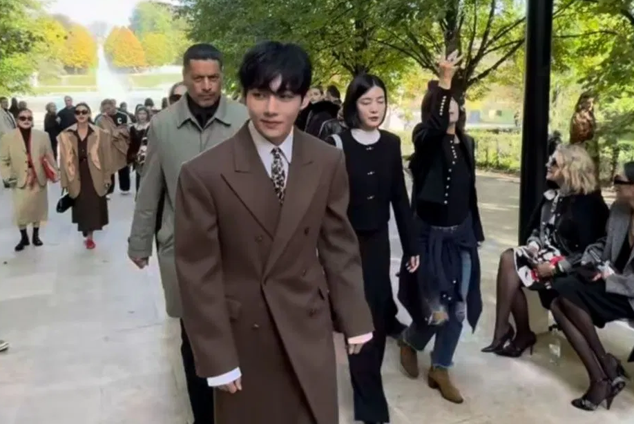 Taehyung arrived looking every inch the Parisian dream in a knee-length brown coat from Michael Rider’s debut collection, paired with matching trousers and that effortlessly magnetic aura only he can pull off. The cameras clicked, the crowd screamed, and then came the moment. Sitting beside Hollywood legend Uma Thurman, Taehyung noticed a strand of her hair out of place—and gently fixed it. That’s it. That’s the tweet. One smooth, respectful motion and suddenly “A Real Gentleman” was trending worldwide.